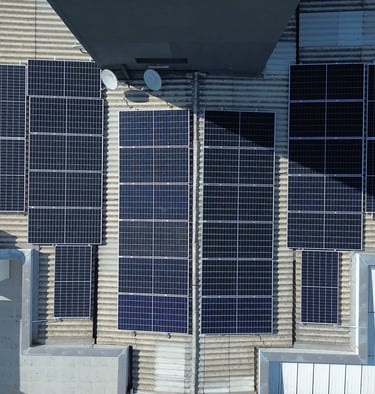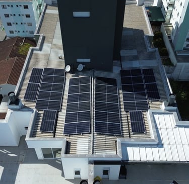 Sistema fotovoltaico instalado em torre de condomínio: placas com pouca inclicação e presença de sombreamento da caixa d'água. Fonte: Arquivo institucional Projamp.